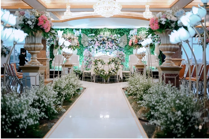 • Suasana Ruangan: Dekorasi jalan (Aisle) 20 meter, Karpet Rumput/Merah, dan Bunga Titik.