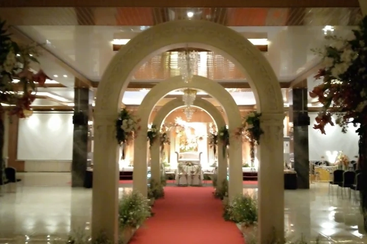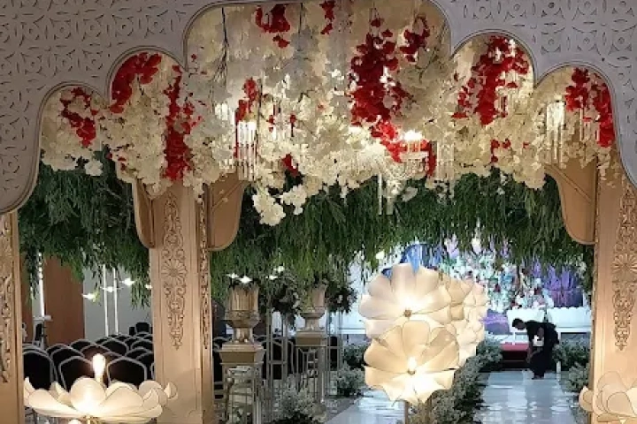 Suasana Ruangan: Dekorasi jalan (Aisle) 20 meter, Karpet Rumput/Merah, dan Bunga Titik.