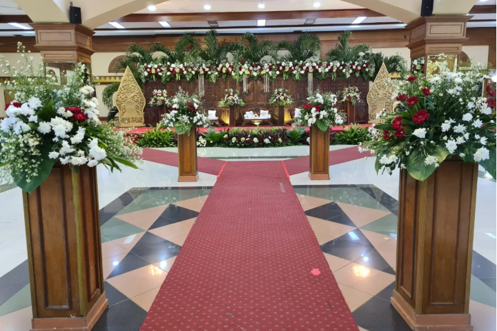 Suasana Ruangan: Dekorasi jalan (Aisle) 20 meter, Karpet Rumput/Merah, dan Bunga Titik.
