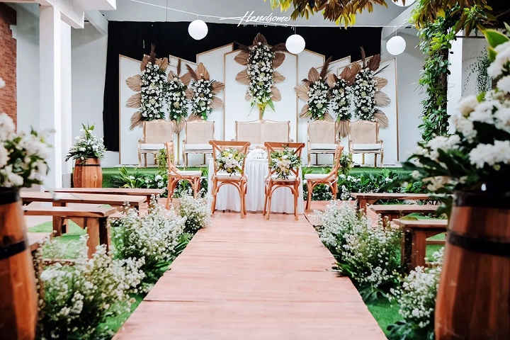 • Suasana Ruangan: Dekorasi jalan (Aisle) 20 meter, Karpet Rumput/Merah, dan Bunga Titik.
