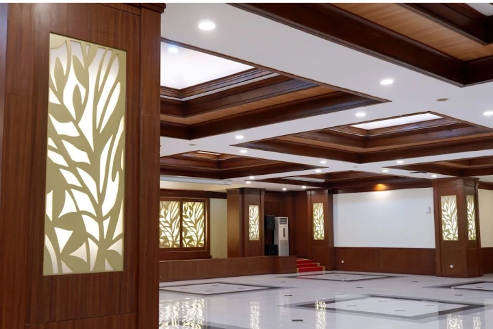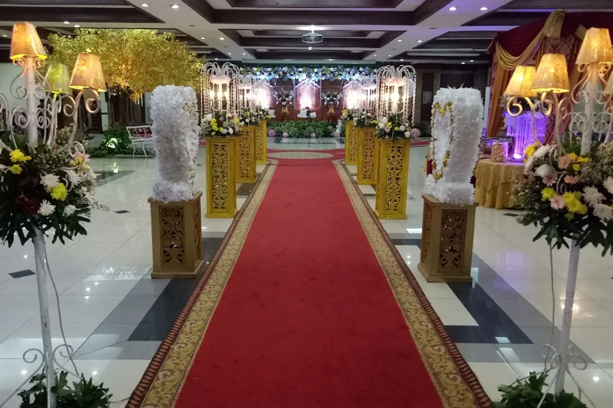 • Suasana Ruangan: Dekorasi jalan (Aisle) 20 meter, Karpet Rumput/Merah, dan Bunga Titik.