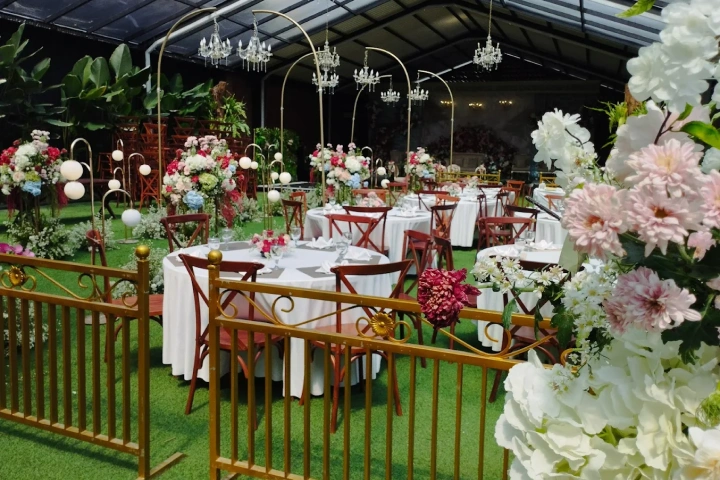 • Pelaminan Eksklusif: Dekorasi panggung utama hingga 10 meter (Custom Style).