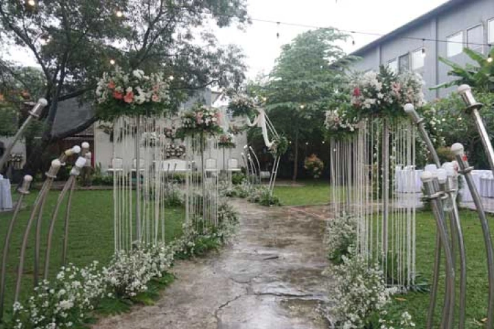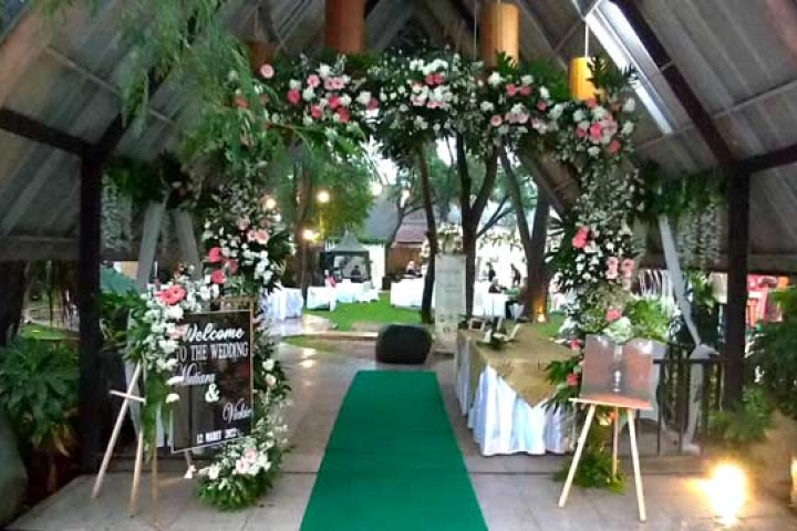 • Suasana Ruangan: Dekorasi jalan (Aisle) 20 meter, Karpet Rumput/Merah, dan Bunga Titik.
