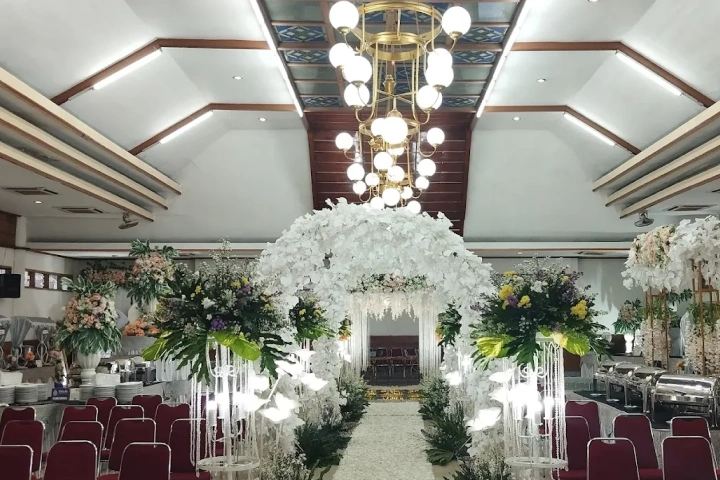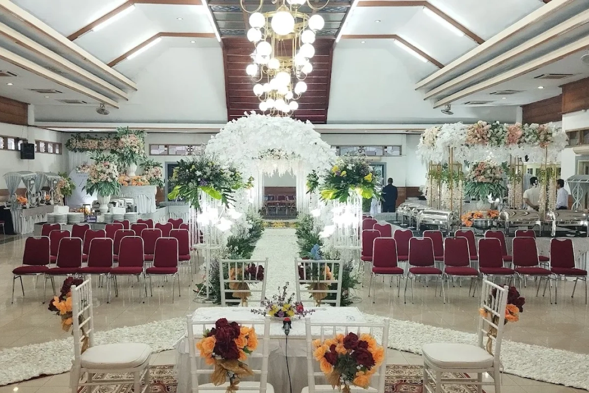Suasana Ruangan: Dekorasi jalan (Aisle) 20 meter, Karpet Rumput/Merah, dan Bunga Titik.
