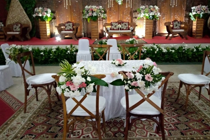 Area Akad Nikah: Set meja akad lengkap dengan dekorasi bunga segar.
