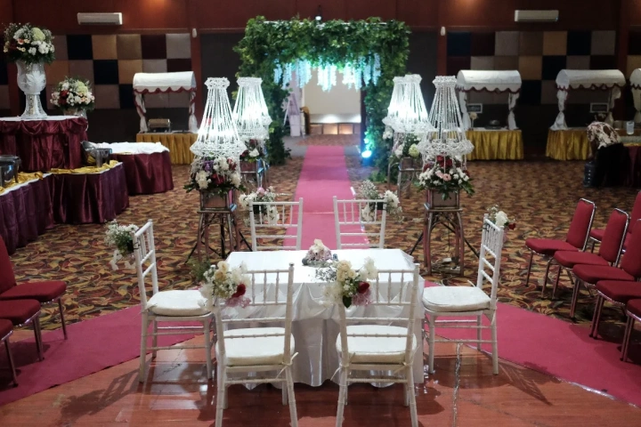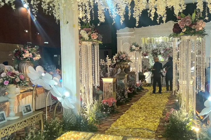 Suasana Ruangan: Dekorasi jalan (Aisle) 20 meter, Karpet Rumput/Merah, dan Bunga Titik.