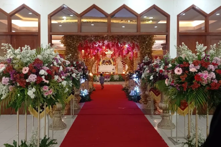 • Suasana Ruangan: Dekorasi jalan (Aisle) 20 meter, Karpet Rumput/Merah, dan Bunga Titik.