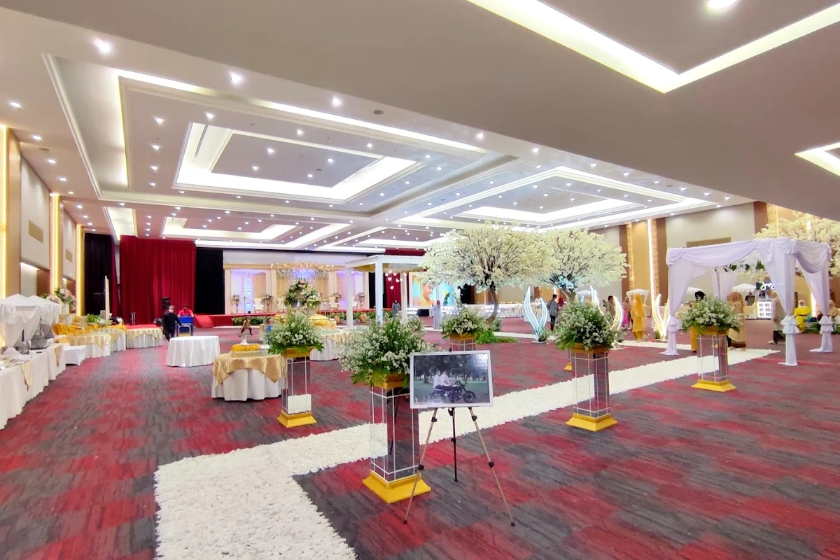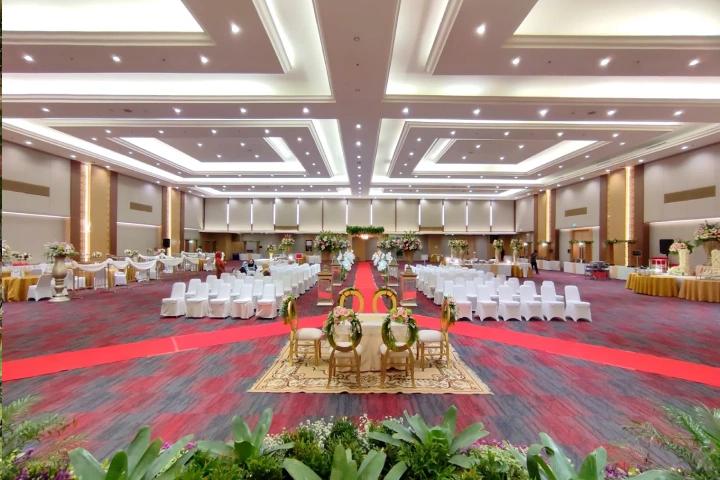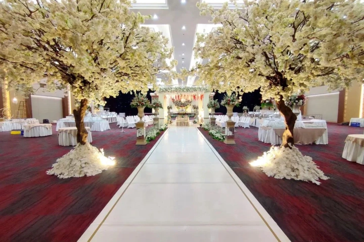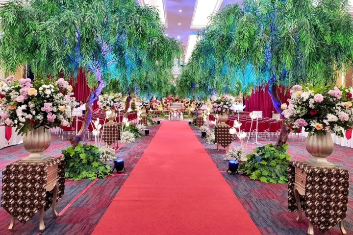 Suasana Ruangan: Dekorasi jalan (Aisle) 20 meter, Karpet Rumput/Merah, dan Bunga Titik.